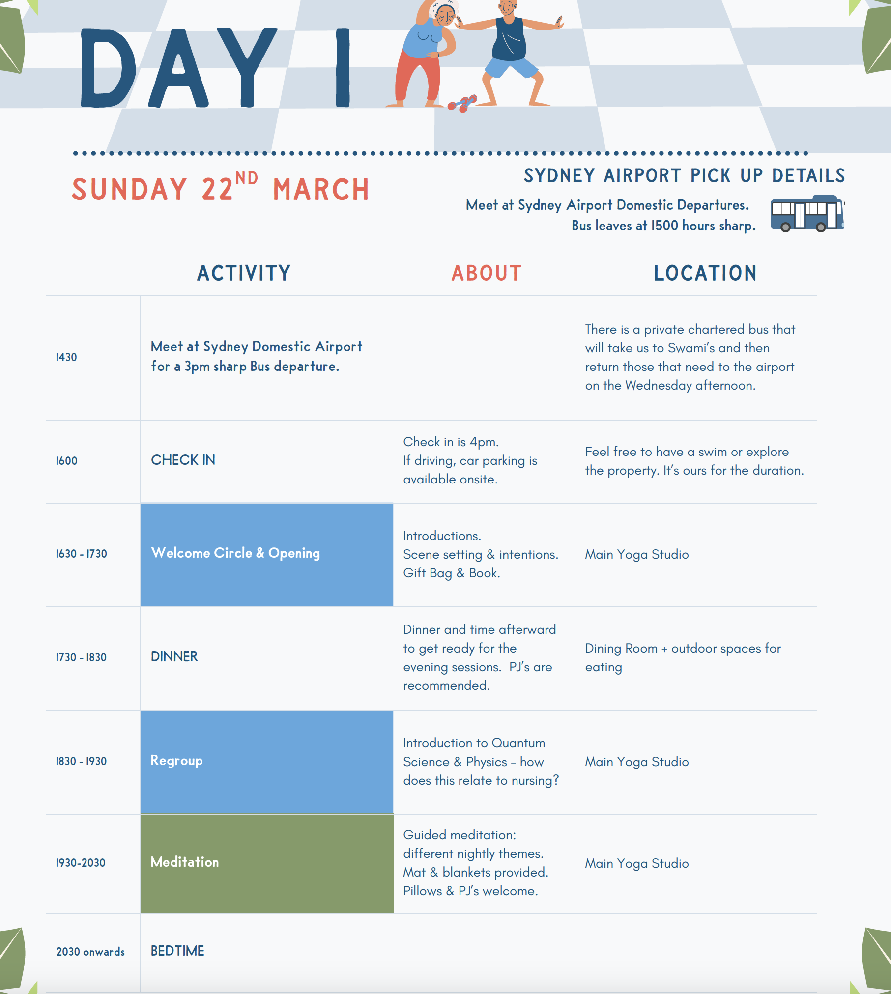 Retreat experience. Your registration and payment covers everything you need while away; all meals, accomodation, education, yoga, meditation, activities and transport to and from Sydney Airport (see program for further details).